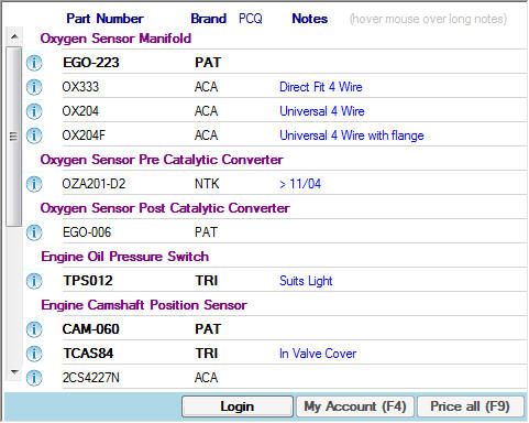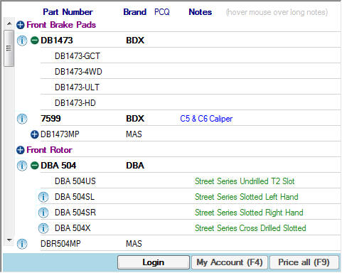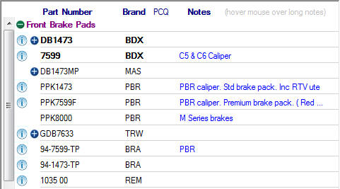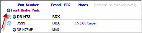 Clicking on the '+' button will expand out the 'Parts List' under that 'Part Heading' to show all Brands. Once clicked the button changes to a '-' button, clicking this will hide the secondary Brands. |
